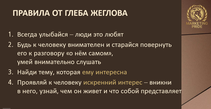 Почему я заговорила про искренность? Потому что нетворкинг работает, только когда он искренен. В глазах, словах, поступках. Когда вы продумываете стратегию общения с конкретным человеком, темы для разговора, или свою презентацию, старайтесь быть максимально честным. Даже если человек вам не особенно симпатичен, попробуйте найти что-то, что вас удивит или заинтересует. Обратите внимание на его манеру говорить, мимику, формулировки фраз, шутки и реакции — если встречаетесь впервые. А если есть возможность наблюдать его в соцсетях или другой обстановке, присмотритесь к привычкам и поступкам.