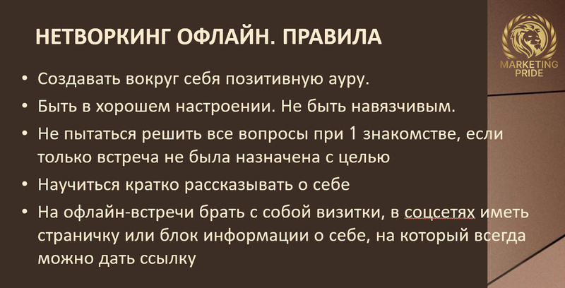 Это я про еще одно правило, которое нам навязали: про то самое внутреннее беспокойство, когда вдруг начинаешь думать: а правда ли, что все эти улыбающиеся люди просто общаются? А вдруг кто-то хочет меня использовать? Возможно. И даже всегда. Но если всё выглядит непринужденно и искренне, нет смысла бояться или осуждать — это классическое «горе от ума». Как с модой: не всем к лицу трендовая одежда; у каждого свои линии, цвета, текстура, вкусы и особенности. Так же и с нетворкингом: это инструмент — для бизнеса, общения, развития и карьеры. Стеснение? — Бросьте.
