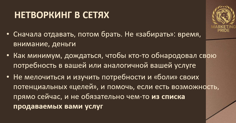 Один из важнейших навыков в нетворкинге – это умение «режиссировать» взаимодействие, а не просто эксплуатировать людей. Вы наблюдаете, анализируете, понимаете, кто куда «вписывается», какие ресурсы и знания может дать, чтобы сложилась цельная картинка.